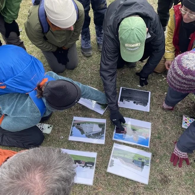 Later, we made our way across North Ave to Ethan Allen Park to learn more about the cultural history of Burlington. We started with an activity: given six photos of Vermont barns, we had to line them up from oldest to newest (a lesson on barn history followed). Feeling very out of my element, I opted to take the below photo of my team doing their darndest to accomplish the task at hand: