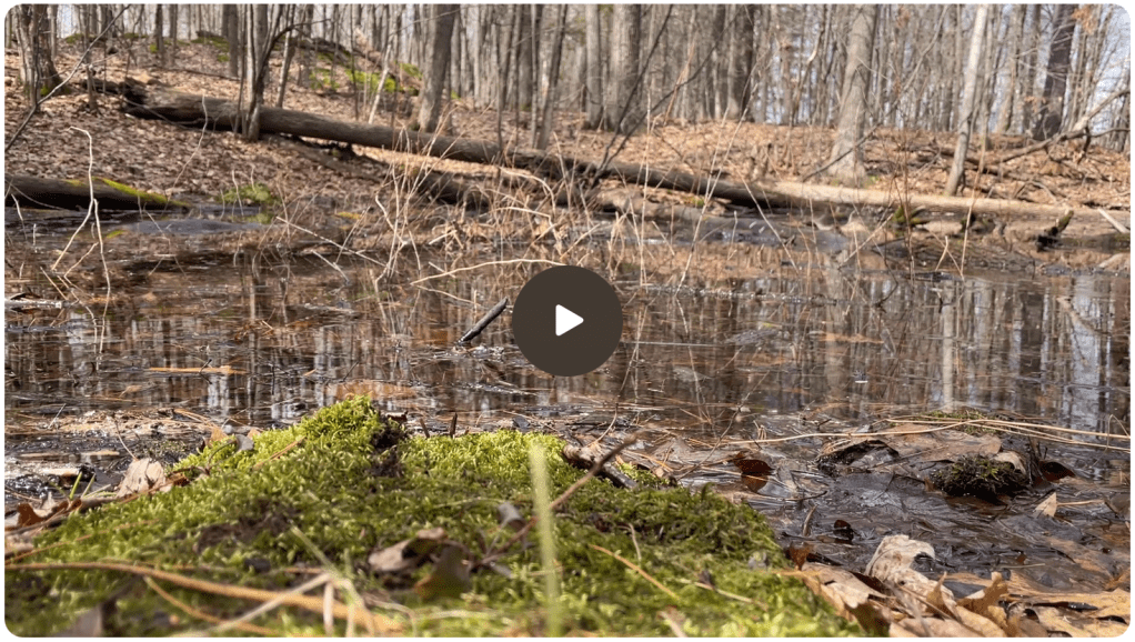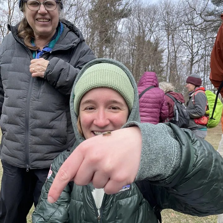 On our way back to the cars after the quarry visit, we wandered off the trail to a vernal pool – temporary, shallow pools that appear in the woods in the spring that serve as essential breeding sites for amphibians. As we approached the pool, the sound grew louder and louder, and our gaggle of chatty naturalists grew quieter and quieter.