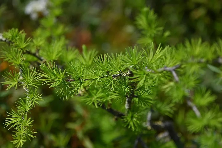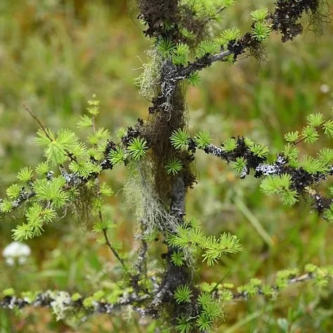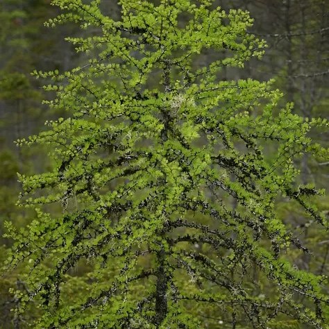Tamarack, tamarack close up with mosses and lichens, and a barren black spruce trunk