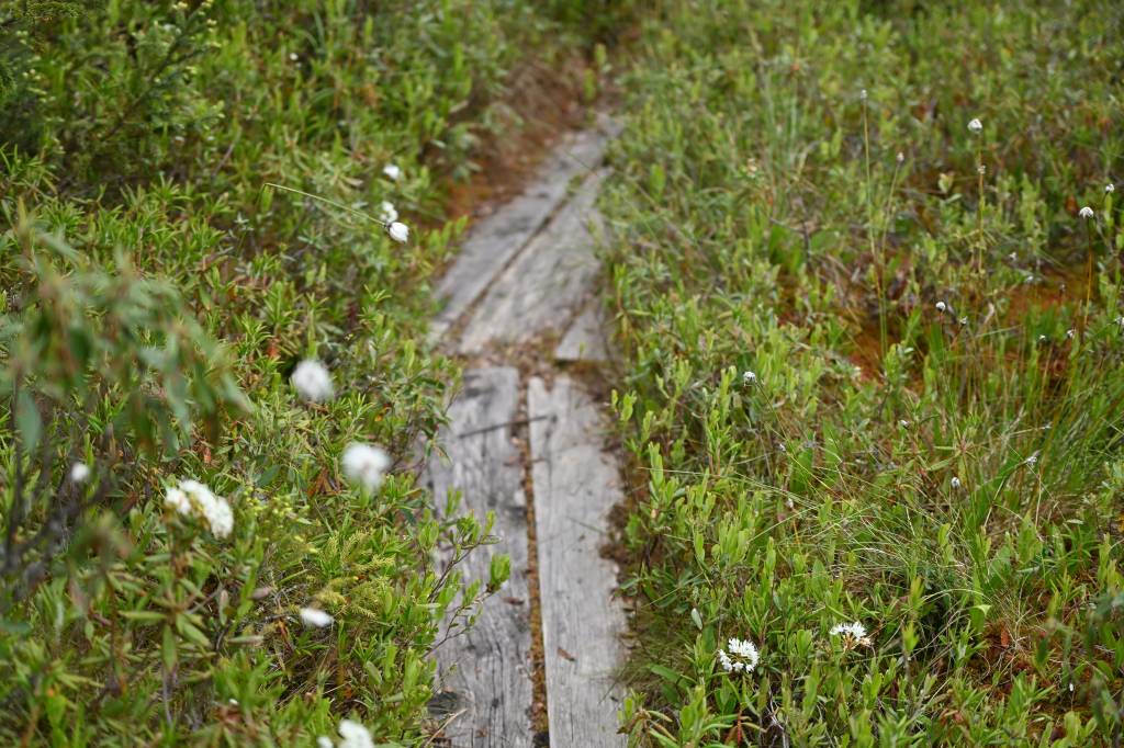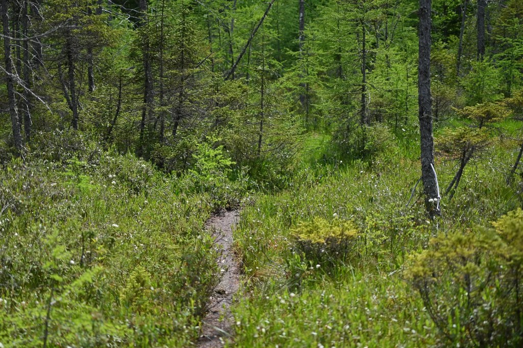 At last we emerge from the damp, buggy woods. The open blue sky greets us, sunshine pouring over the expanse of mossy peat stretching out into the distance. The whole basin seems to glow. Towering black spruce trees loom like sentinels as we step onto the narrow, overgrown boardwalk, while little tufts of cotton grass cheerfully dot the lush greenery beneath. The strange waxy forms of purple pitcher plant flowers lend an air of surreality to the landscape, as if we’ve just stepped into another world entirely. In some ways, we have– the ecology here is completely different from that of the land surrounding it. Though perhaps stepping into another time would be a more appropriate description.