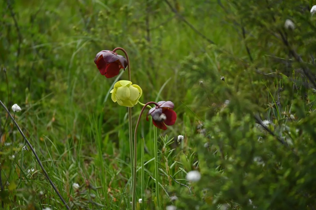Perhaps the most fascinating of the bog species are the pitcher plants, who get their nutrients not from the substrate or water, but from the bodies of insects that fall into their hollow tubes.