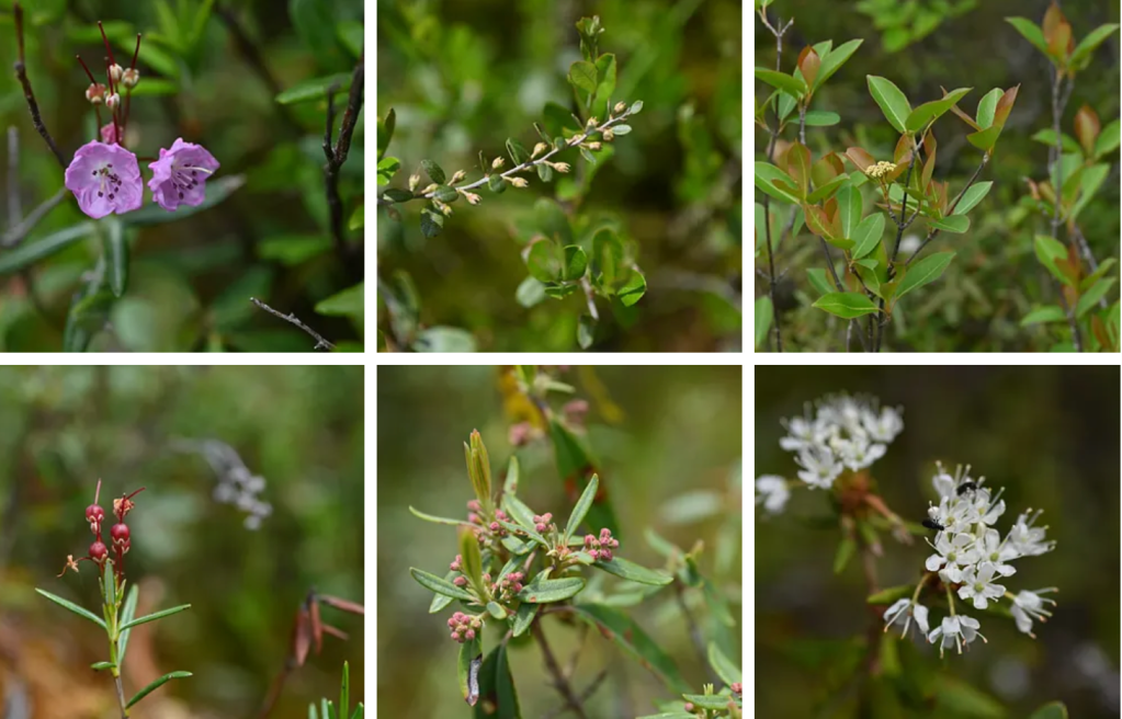 From left to right, top to bottom: swamp laurel, leatherleaf, northern wild raisin, swamp laurel, sheep laurel, bog labrador tea