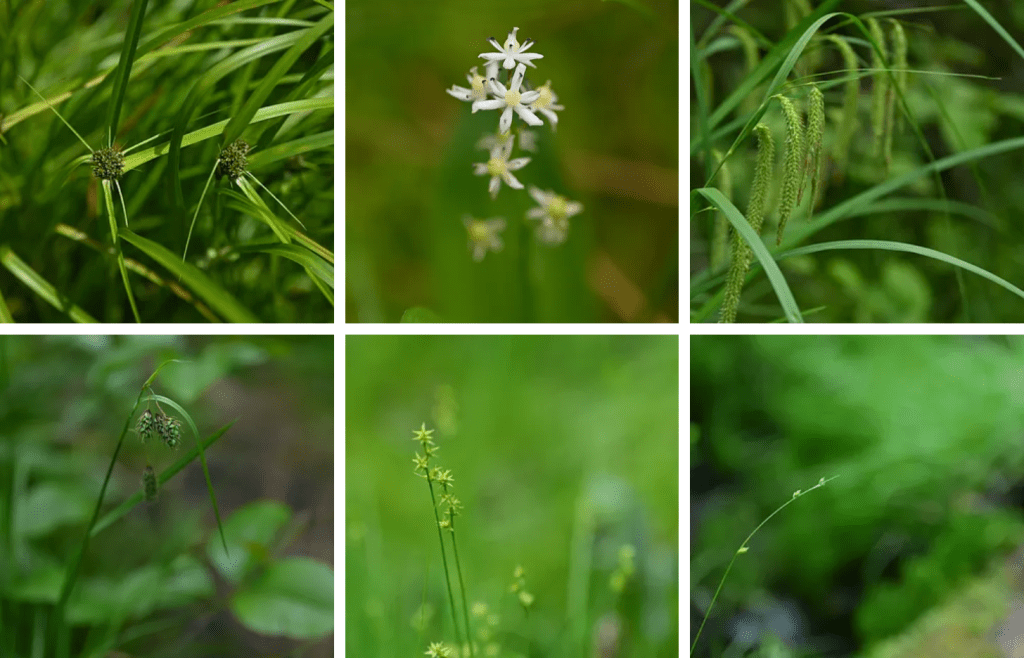 Left to right, top to bottom: a bulrush, three-leaved falso solomon’s seal, fringed sedge, tall bog sedge, star sedge, and either two- or three-seeded sedge