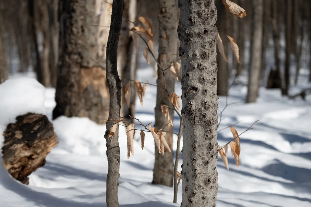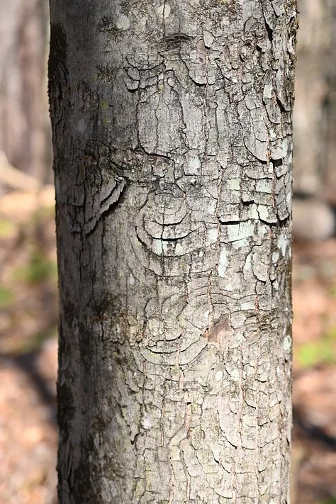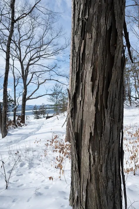 a shagbark hickory’s distinct bark, target canker on a red maple trunk, an ash sprouting from its stump