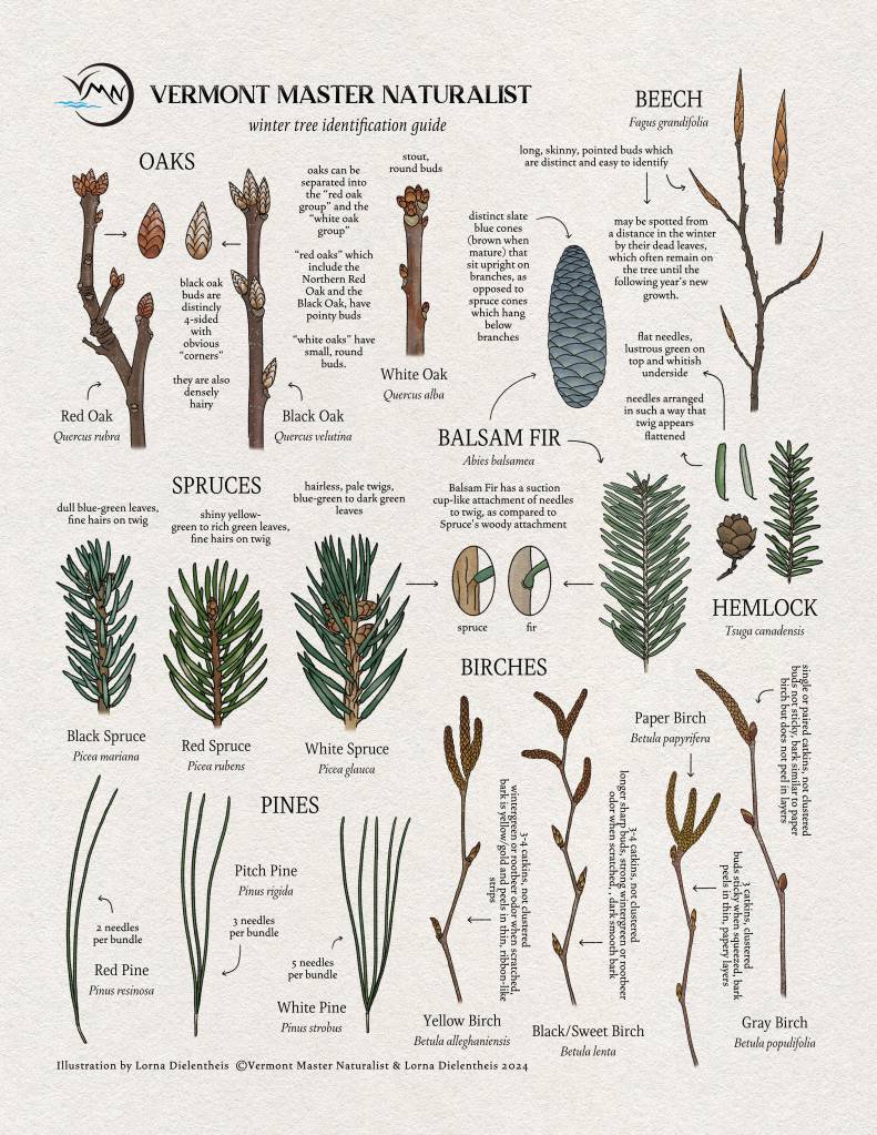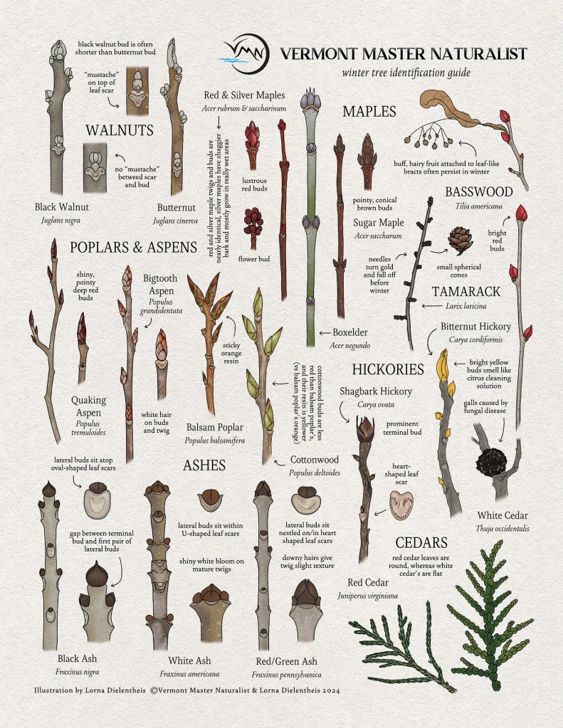 I’d been introduced to tree ID before, had tried to memorize each species’ unique characteristics, and spent hours working my way through keys in various field guides. But the knowledge didn’t stick. It came and went, as fleeting as the leaves I pored over. Then in the fall of 2023 I was met with an incredible opportunity: to create an illustrated winter twig guide for one of my favorite clients, Vermont Master Naturalist.