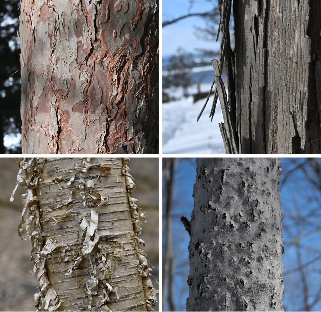 a few examples of trees with really distinct bark, from left to right, top to bottom: red pine, shagbark hickory, yellow birch, beech (diseased)