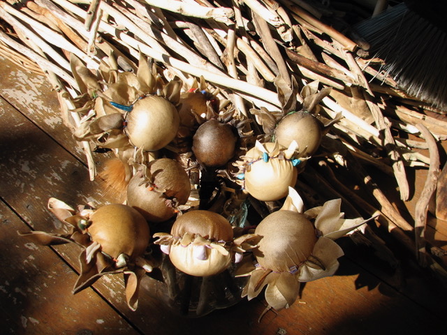 Each fall, I must find corn. I fill the rattles with hard flint corn. Corn doesn’t split and become dusty like beans. It makes a dry pleasing sound. (The tone of each rattle is unique.) I like to know who grew the corn. I like making that connection. One time on a whim in a lean corn year, I ask gentleman farmer friend if he grew it. He said yes. I thought I might get an ear or two. Instead, he led me into in sun porch where dozens of ears of colorful corn