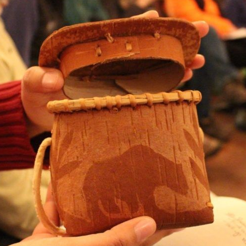 Makuk birch bark basket shared with VMN Burlington naturalists by Allaire Diamond (photo by Garrett Chisholm.)