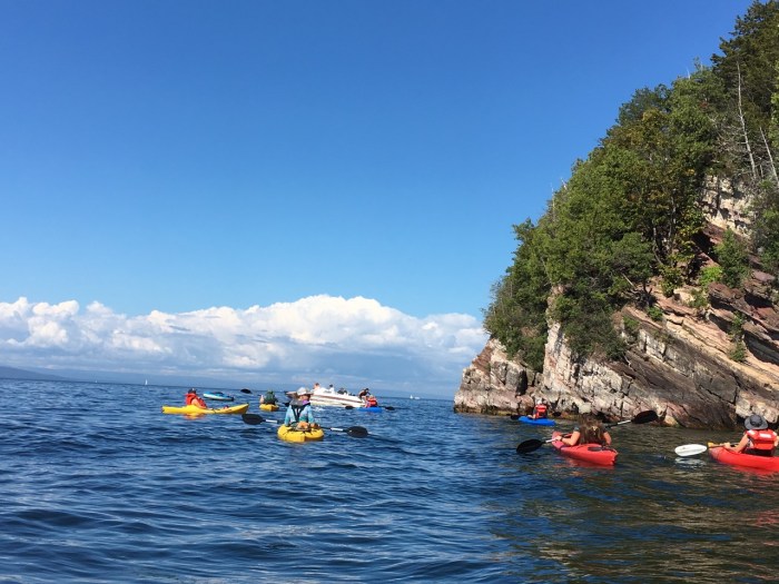 Kayaking with VMN South Burlington naturalists, who are led by Field Naturalist Sophie Mazowita, at Red Rocks Park where the Monkton layer of the Champlain Thrust Fault is exposed (top photo by Sophie Mazowita.) VMN Bristol 5 Town naturalists explore the anticline in the Cheshire formation at the Waterworks Property with hydrogeologist Bill Norland (middle photos by Monica Erhart.) VMN South Hero naturalists hunt for bryozoa, brachiopod and trilobite fossils in the Glens Falls Limestone and leave them behind for others to enjoy at Lessor’s Quarry with geologist Steve Howe (bottom photos by Guy Maguire.)