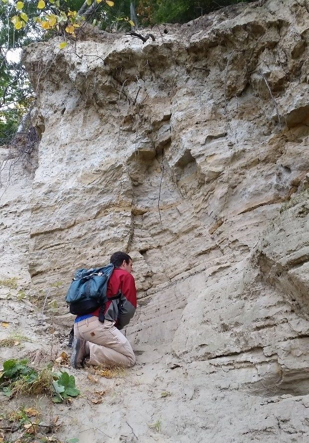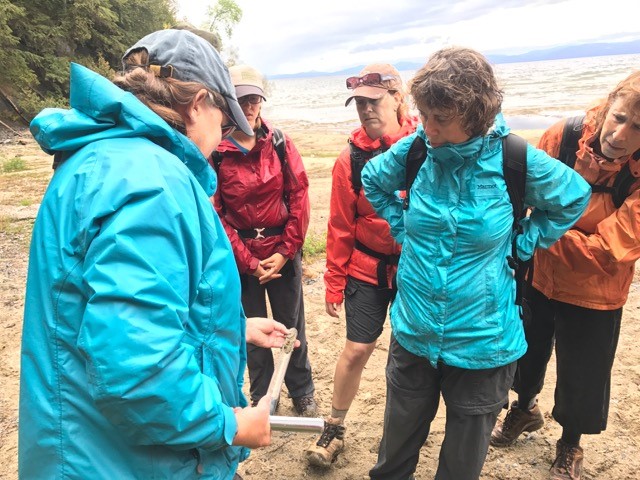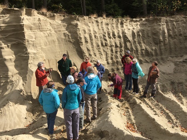 VMN Richmond naturalists dig into their town’s glacial history with hydrogeologist Craig Heindel (top two photos by Kate Blofson.) VMN Burlington naturalists explore a glacial delta (middle left photo by Becca Harris; middle right photo by Sophie Mazowita.) VMN Williston naturalists hike a transect along the Winooski River from bedrock to glacial till to clay up into to a sandy delta with Field Naturalist Sean Beckett (bottom three photos by Cheryl Dorschner.)