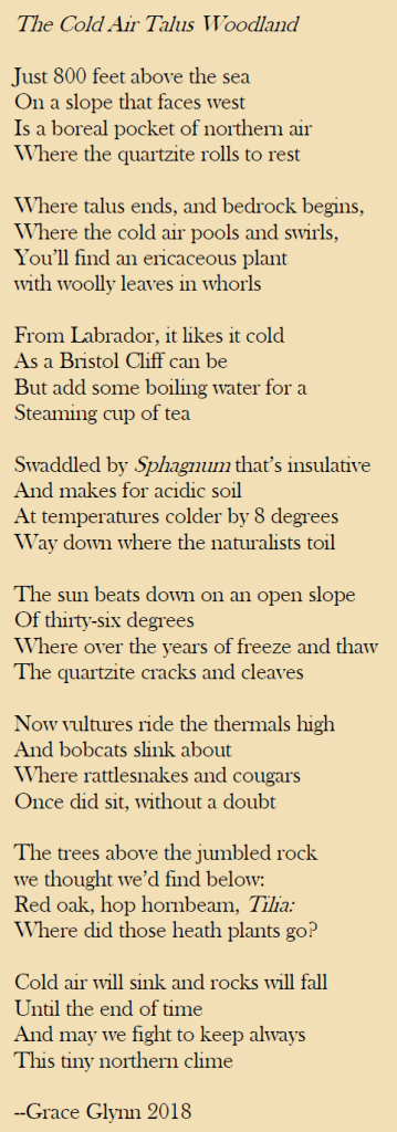 The Vermont Master Naturalist Program is designed upon this approach–a bedrock to birds exploration of each town. Special locations are chosen because they have stories to tell. Laid down on its side, the layer cake becomes a timeline of Vermont natural history.