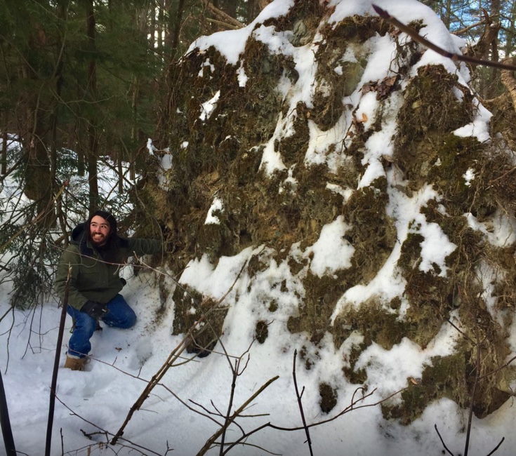 Examining a White Pine tip up Mud Pond Conservation Area with VMN Williston (photo by Cheryl Dorschner.)