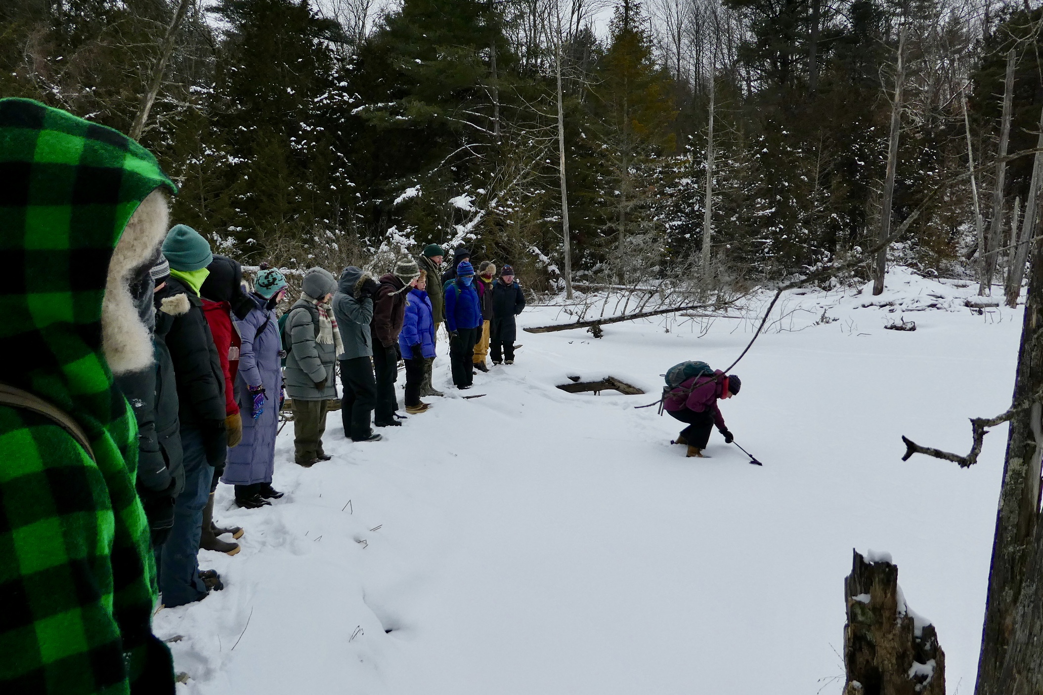 Looking at tracks on a frozen beaver pond and exploring a porcupine den at Raven Ridge Natural area with VMN Bristol 5 Town naturalists.