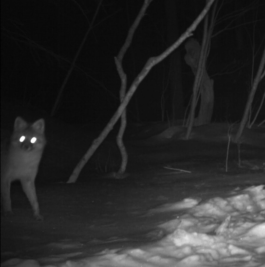 Grey fox tracks in the new Burlington Urban Wilds park (photo by Sophie Mazowita) and a grey fox captured on a trail camera at North Branch Nature Center in preparation for a field trip with NBNC naturalists Sean Beckett and Dave Muska and the VMN Winooski Headwaters team (photo: selfie by the fox.)